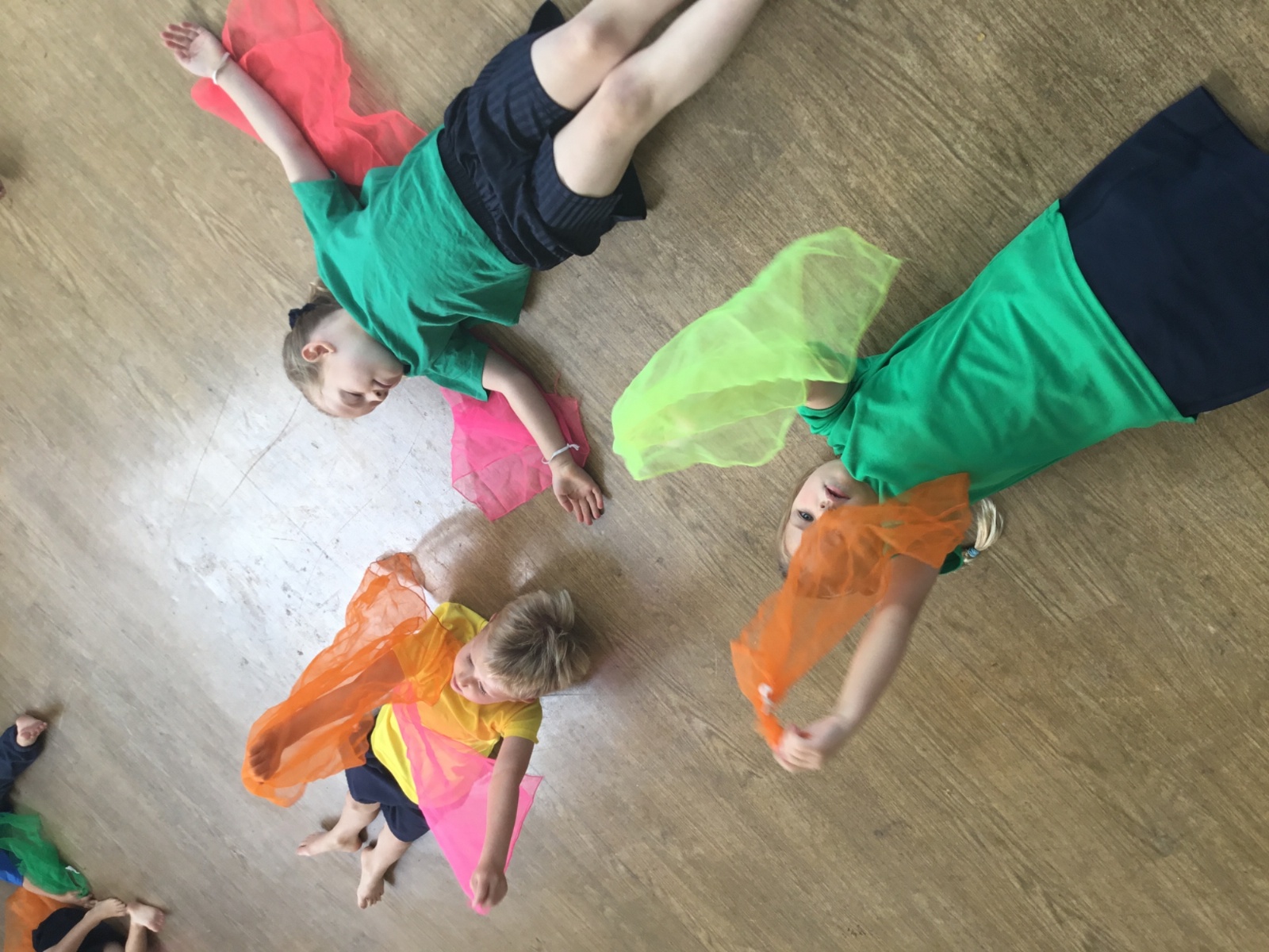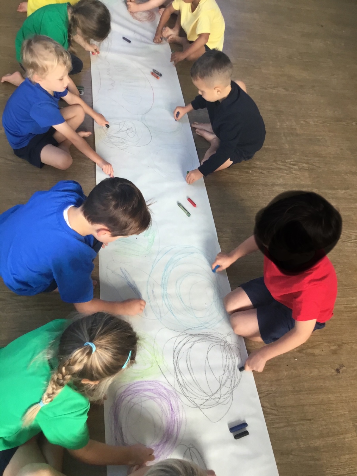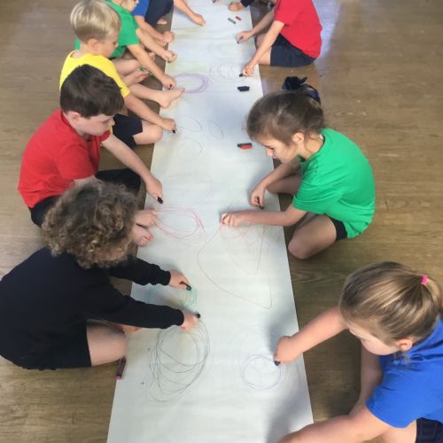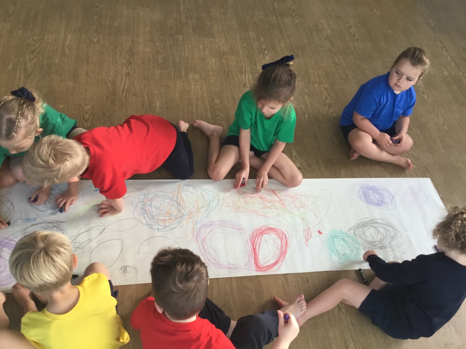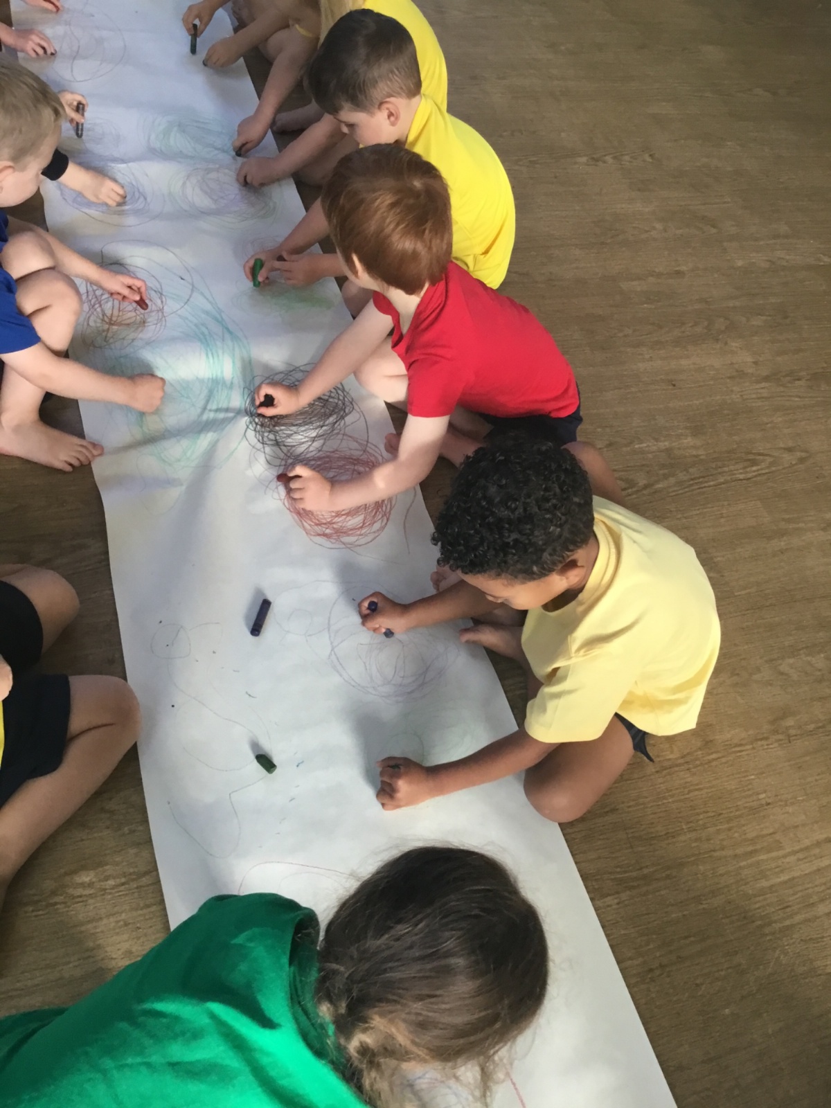 This week in Write Dance, we used our imaginations to take a peaceful walk through the countryside. Lying on our backs, we followed the winding country path with our scarves, spotting a variety of creatures along the way. Afterwards, we brought our journey to life by putting crayon to paper and illustrating the scenes we imagined.