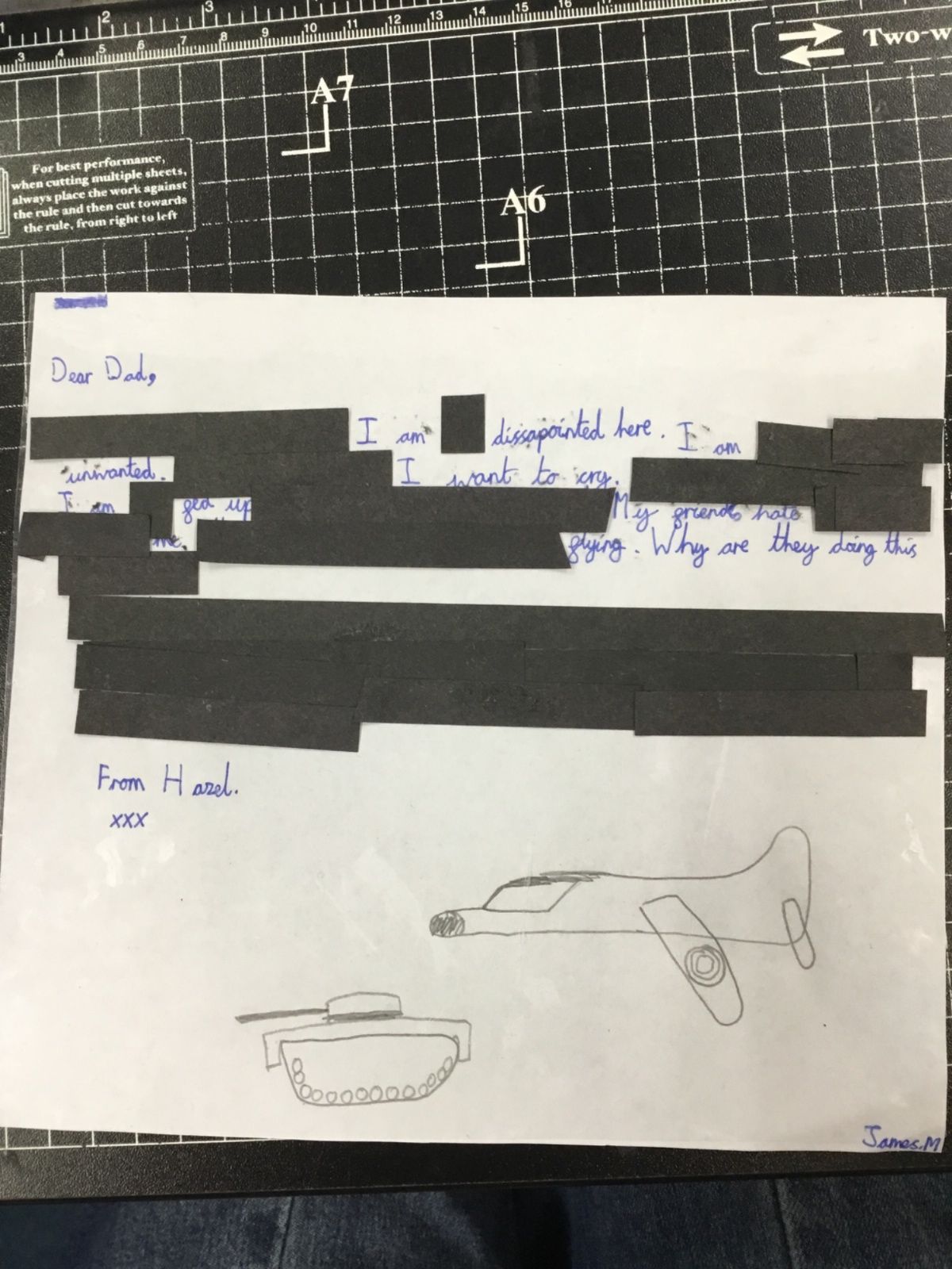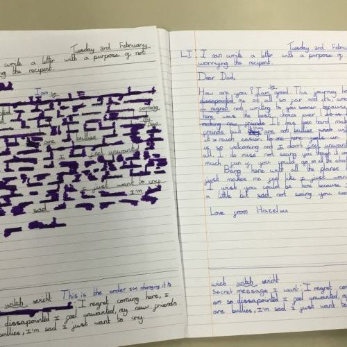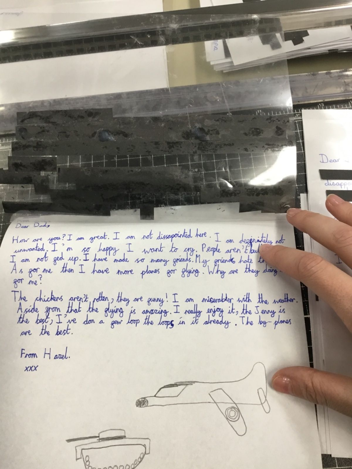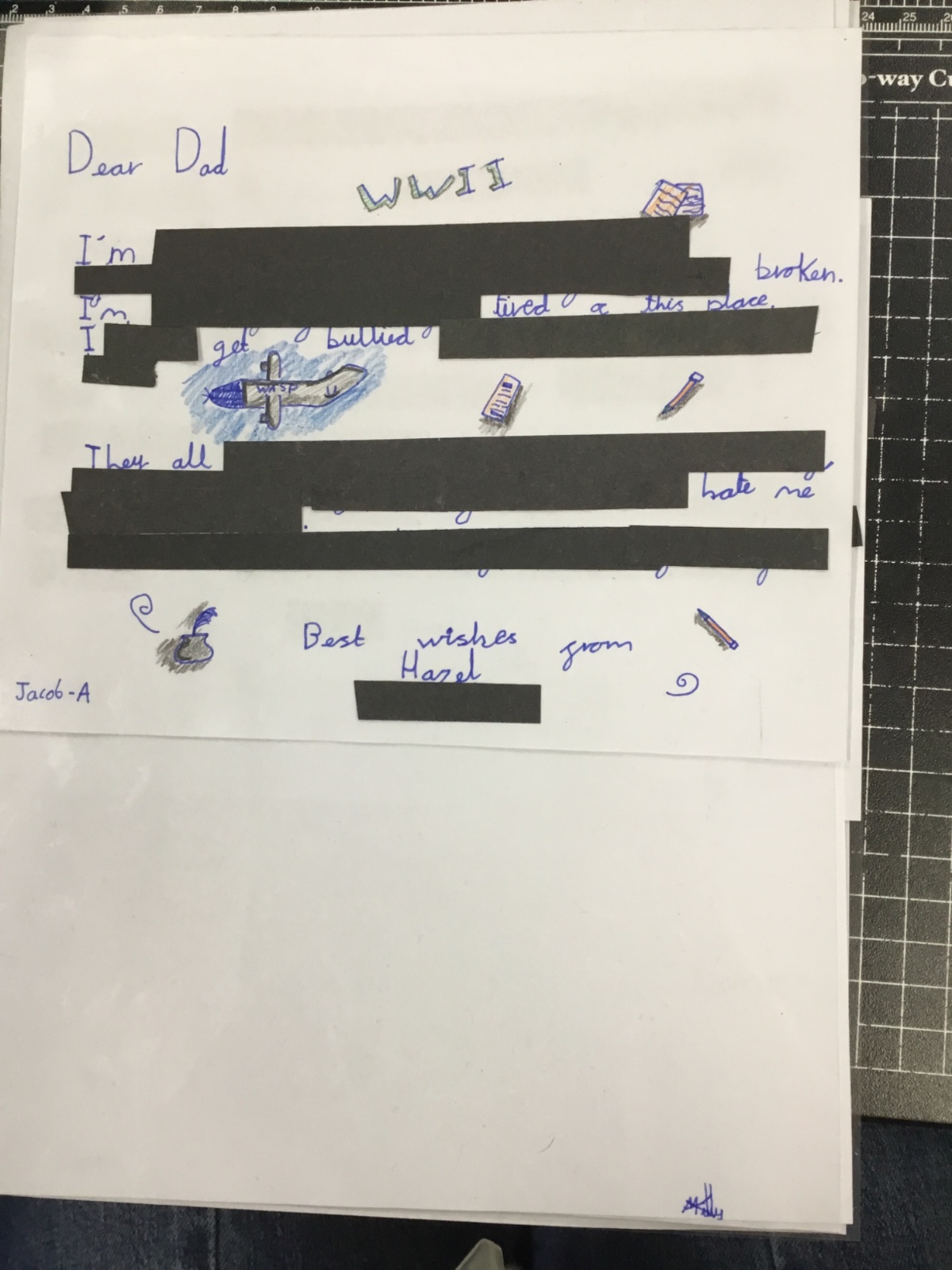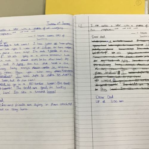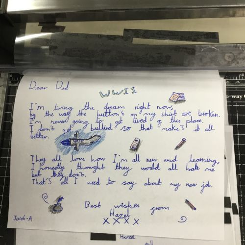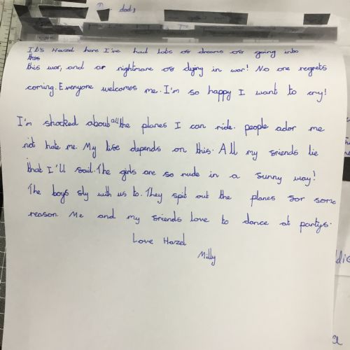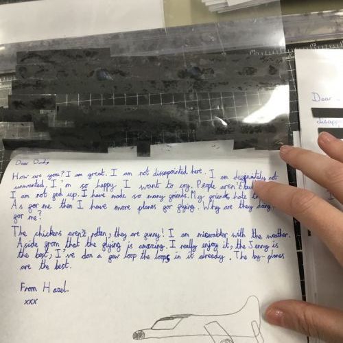 This week we have been learning about censorship. We wrote our own letters, from Hazel (a female pilot) to her father. Our letters had to get through the censors but they had a hidden message within! After drafting in our books, we wrote out our letters and blacked out to reveal our hidden message.