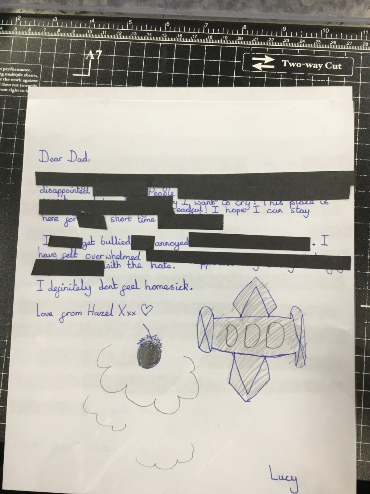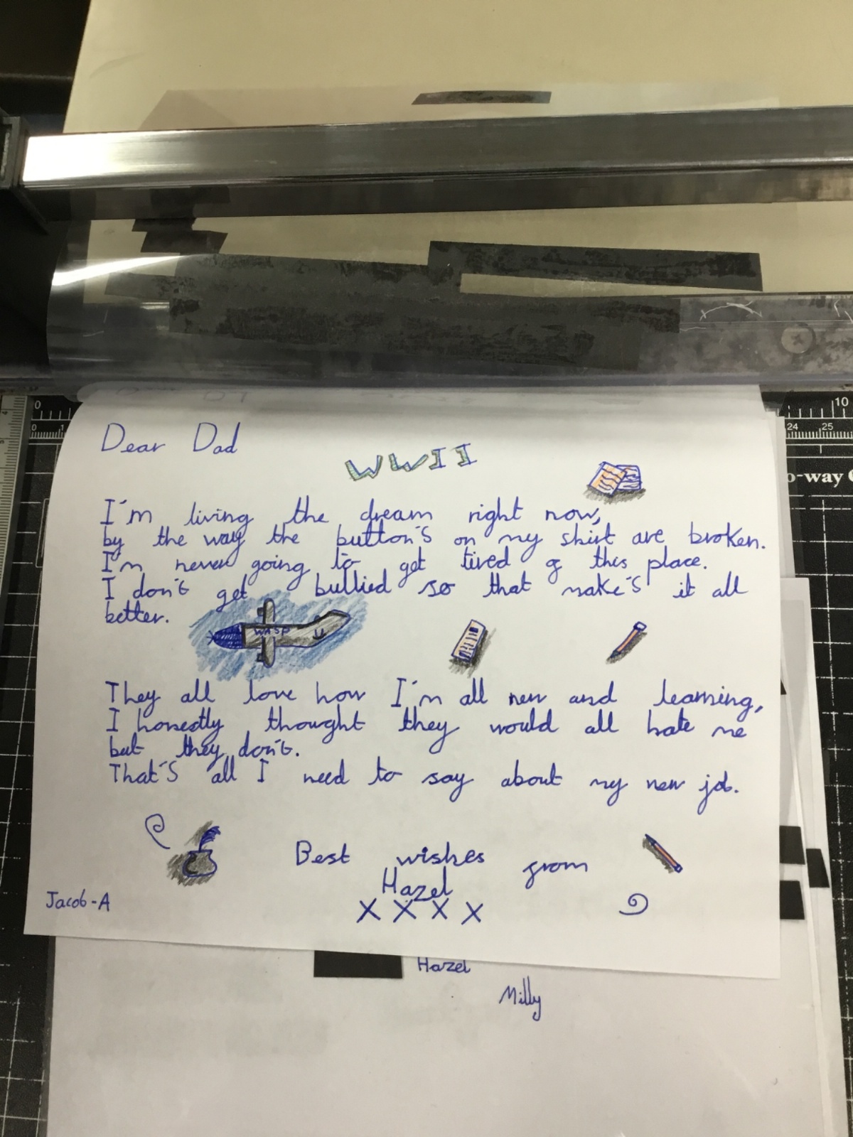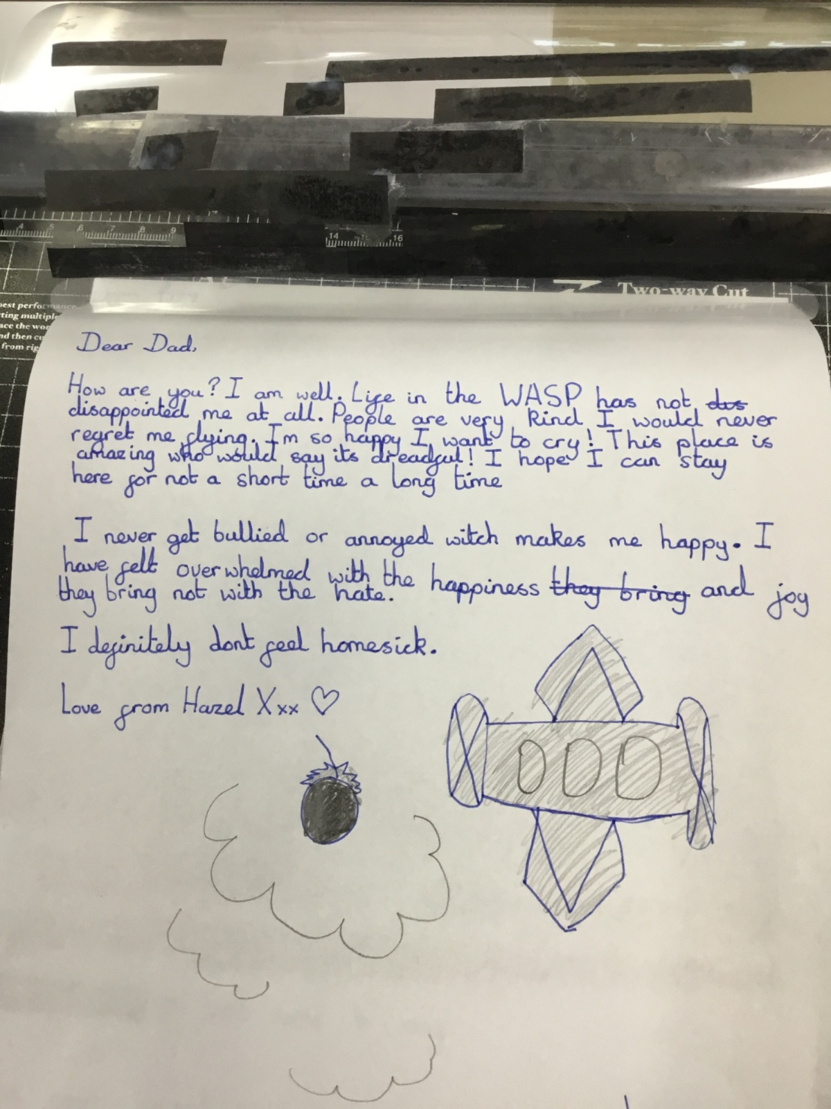 This week we have been learning about censorship. We wrote our own letters, from Hazel (a female pilot) to her father. Our letters had to get through the censors but they had a hidden message within! After drafting in our books, we wrote out our letters and blacked out to reveal our hidden message.