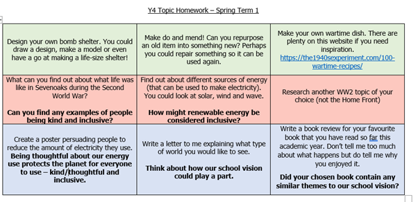 Topic grid - Our other homework is to choose an activity from the topic grid (which you can see below). We have two weeks for each project.